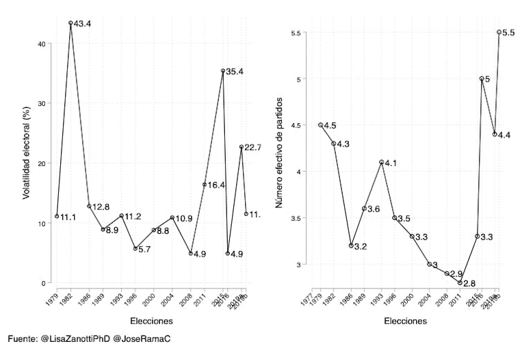 La inestabilidad política reciente queda bien retratada en los dos gráficos de abajo. En el panel de la izquierda, se observa el intercambio de preferencias partidistas entre elecciones consecutivas (lo que se conoce como volatilidad electoral), y en el de la derecha se muestra la evolución del número efectivo de partidos, es decir, del número de partidos que tienen peso a nivel electoral.
