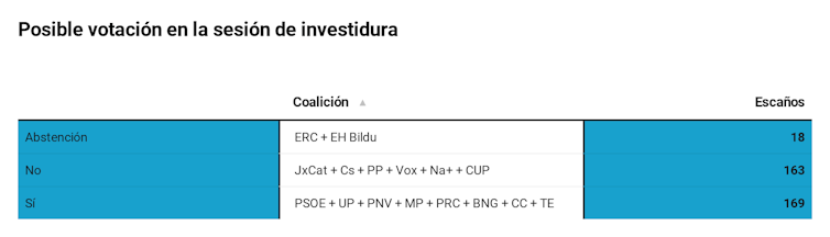 La Tabla 1 es una tentativa de supuesta votación de los partidos políticos en la futura sesión de investidura a la que, previsiblemente –tras las consultas con el Jefe de Estado, el rey Felipe VI– se someterá Pedro Sánchez, quién presentará su acuerdo de gobierno con UP. Aunque varios de los escaños pueden moverse, sobre todo es incierta la posición de partidos como ERC, Junts per Catalunya o Ciudadanos, nuestro ejercicio de simulación señala que, en segunda votación y tras obtenerse más síes que noes, España, finalmente podrá formar Gobierno.